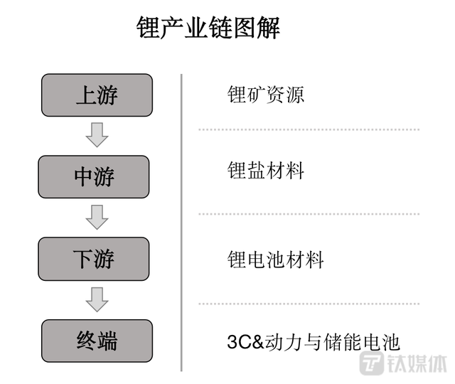從鋰的產(chǎn)業(yè)鏈條來看,電池所需的鋰鹽(即碳酸鋰、氫氧化鋰等鋰化合物)屬于中游部分。繼續(xù)向上追溯,鋰價(jià)的不斷攀升其實(shí)是從鋰礦到鋰鹽再到鋰電池的一次全鏈條輻射。