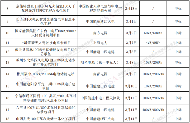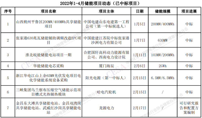 2022年1-4月儲能項目(中標(biāo))統(tǒng)計: