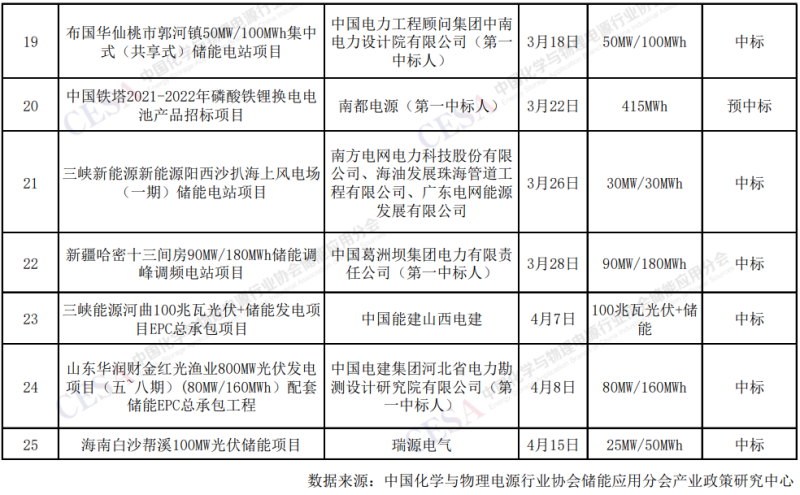 中國儲能網(wǎng)訊:據(jù)中國化學(xué)與物理電源行業(yè)協(xié)會儲能應(yīng)用分會產(chǎn)業(yè)政策研究中心不完全統(tǒng)計,2022年1-4月,儲能項目中標(biāo)25個。其中,百兆瓦儲能項目11個,華能電芯采購項目2GWh。