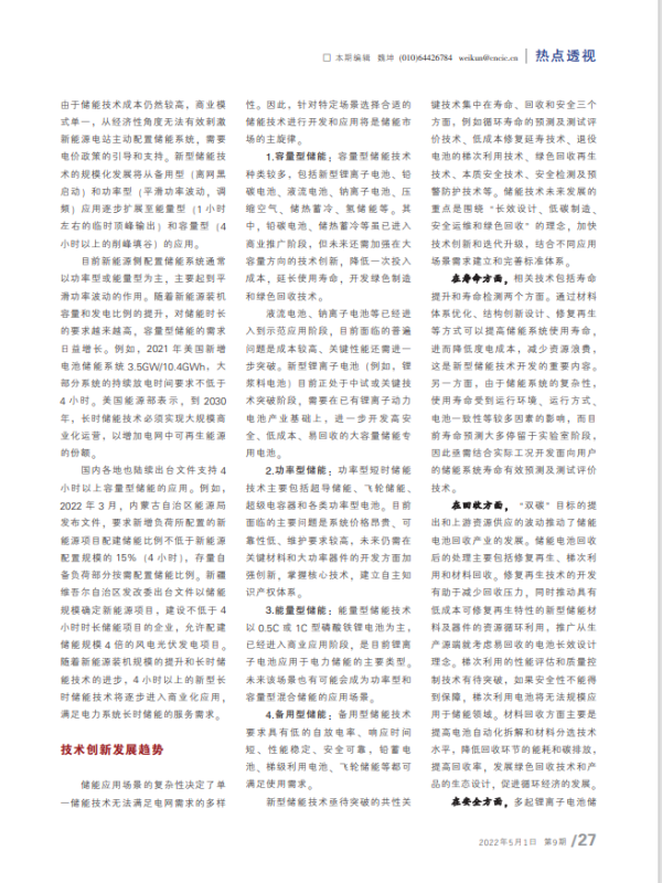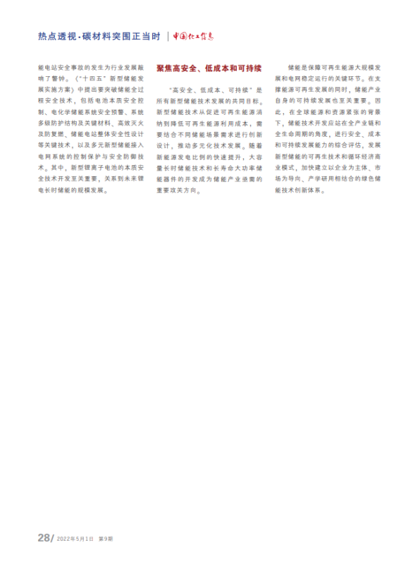“高安全、低成本、可持續(xù)”是所有新型儲能技術(shù)發(fā)展的共同目標。新型儲能技術(shù)從促進可再生能源消納到降低可再生能源利用成本,需要結(jié)合不同儲能場景需求進行創(chuàng)新設(shè)計,推動多元化技術(shù)發(fā)展。隨著新能源發(fā)電比例的快速提升,大容量長時儲能技術(shù)和長壽命大功率儲能器件的開發(fā)成為儲能產(chǎn)業(yè)亟需的重要攻關(guān)方向。