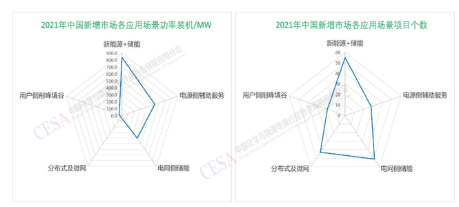 圖表3–8 2021年中國(guó)新增電化學(xué)儲(chǔ)能市場(chǎng)功率裝機(jī)及項(xiàng)目個(gè)數(shù)分布
