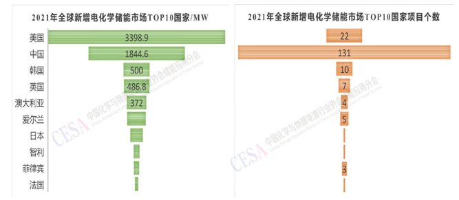 2021年,全球新增電化學(xué)儲(chǔ)能市場(chǎng)TOP10國(guó)家依次是:美國(guó)(3398.9 MW)、中國(guó)(1844.6 MW)、韓國(guó)(500 MW)、英國(guó)(486.8 MW)、澳大利亞(372 MW)、愛爾蘭(354.5 MW)、日本(240.0 MW)、智利(112.0 MW)、菲律賓(100.0 MW),法國(guó)(61 MW)、十個(gè)國(guó)家電化學(xué)儲(chǔ)能項(xiàng)目個(gè)數(shù)依次為22、131、10、7、4、5、1、1、3、1。