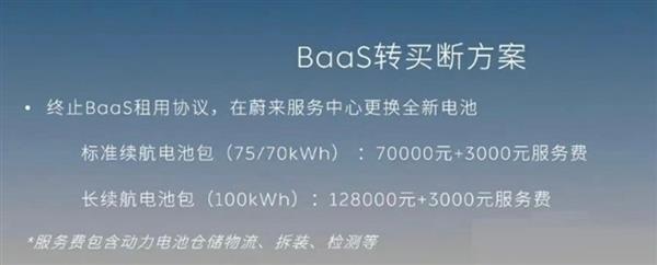 中國儲能網(wǎng)訊:日前,我們從蔚來App社區(qū)了解到,蔚來將推出BaaS轉(zhuǎn)買斷方案,標準續(xù)航電池包(75/70kWh)的費用為70000元;長續(xù)航電池包(100kWh)的費用為128000元。