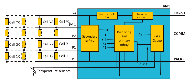 圖4顯示了一個典型的電池管理系統(tǒng)(BMS)示例。在這一設(shè)計中,每個電池單元(并聯(lián)電池組)的電壓由兩個獨(dú)立的組件(主要和次要安全)監(jiān)控。這兩個組件可以關(guān)閉放電或充電電流,熔斷不可復(fù)位的保險絲或激活保護(hù)MOSFET。溫度和電流(通過分流器測量)也受到監(jiān)控,如果溫度或電流超出電池的推薦電流和溫度范圍,安全組件可以中斷電流。