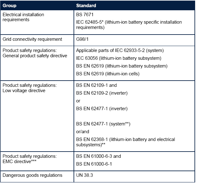 英國對電池儲能系統(tǒng)的安全要求可分為電氣安裝要求、電網(wǎng)連接要求、產(chǎn)品安全監(jiān)管要求以及危險品監(jiān)管要求。