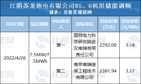 中國儲(chǔ)能網(wǎng)訊:4月25日,江陰蘇龍熱電有限公司發(fā)布#5、6機(jī)組儲(chǔ)能輔助調(diào)頻項(xiàng)目中標(biāo)候選人公示。其中第一候選人為國網(wǎng)電力科學(xué)研究院武漢南瑞有限責(zé)任公司,儲(chǔ)能單價(jià)3.18元/Wh,第二候選人為南京南瑞繼保工程技術(shù)有限公司,儲(chǔ)能單價(jià)3.17元/Wh。