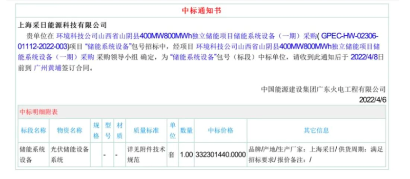 4月6日,上海采日能源科技有限公司喜獲“儲能系統(tǒng)設備”包號(標段)《中標通知書》。