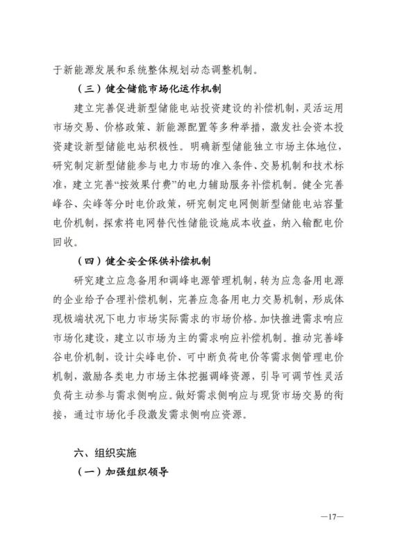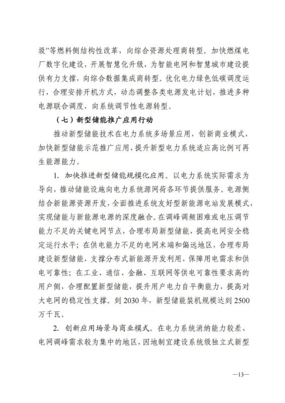 1、加快推進新型儲能規(guī)模化應(yīng)用。以電力系統(tǒng)實際需求為導(dǎo)向,推動儲能設(shè)施向電力系統(tǒng)源網(wǎng)荷各環(huán)節(jié)提供服務(wù)。電源側(cè)結(jié)合新能源資源開發(fā),全面推進系統(tǒng)友好型新能源電站發(fā)展模式,實現(xiàn)儲能與新能源電源的深度融合。在調(diào)峰調(diào)頻困難或電壓調(diào)節(jié)能力不足的關(guān)鍵電網(wǎng)節(jié)點,合理布局新型儲能,提高電網(wǎng)安全穩(wěn)定運行水平;在供電能力不足的電網(wǎng)末端和偏遠地區(qū),合理布局建設(shè)新型儲能,支撐分布式新能源開發(fā)利用,保障用電需求和供電可靠性;在工業(yè)、通信、金融、互聯(lián)網(wǎng)等供電可靠性要求高的用戶側(cè),合理配置新型儲能,提升用戶電力自平衡能力,提高對大電網(wǎng)的穩(wěn)定性支撐。到2030年,新型儲能裝機規(guī)模達到 2500萬千瓦。