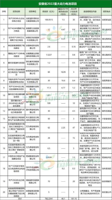 這僅僅只是自2021年以來在安徽進(jìn)行的動力電池項(xiàng)目中很平常的一個。在今年2月份公布的安徽省2022重大項(xiàng)目名單中,有二十項(xiàng)動力電池項(xiàng)目,項(xiàng)目建成后將有超過124GWh的產(chǎn)能提供動力電池,投資總額大約782億元。