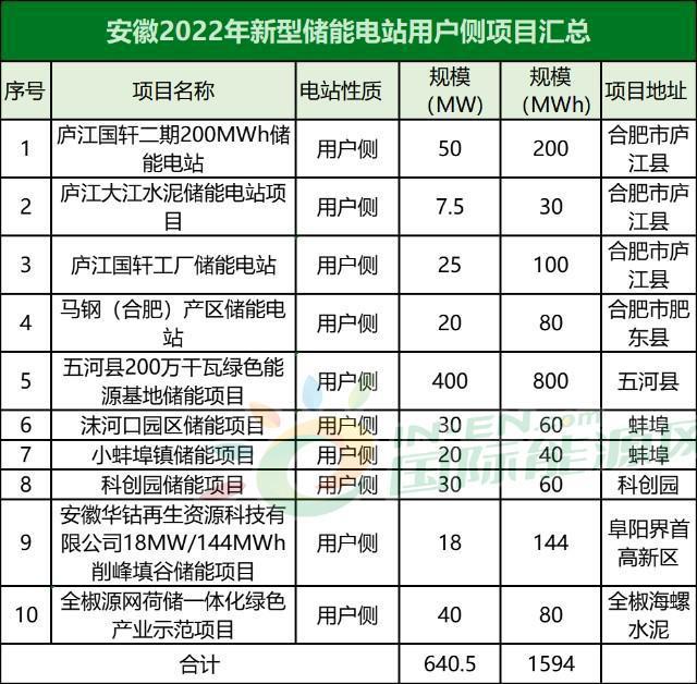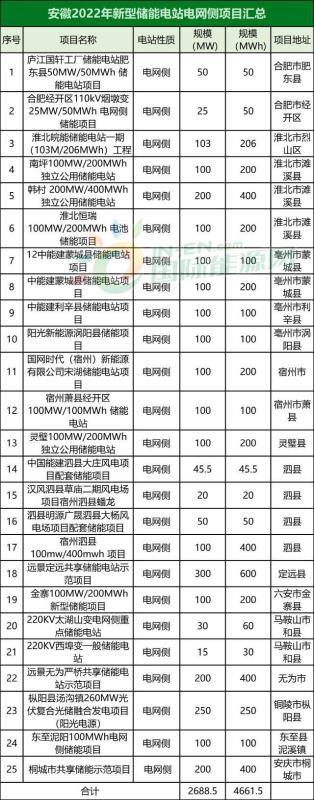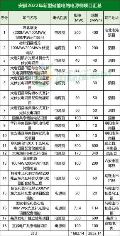 安徽省統(tǒng)計局?jǐn)?shù)據(jù)顯示,2020年,安徽省可再生能源發(fā)電量363.4億千瓦時,達(dá)到2015年的3.2倍。2021年,全省可再生能源發(fā)電量459.6億千瓦時,同比又大幅增長26.3%。儲能的加入使得安徽能源的轉(zhuǎn)型越發(fā)穩(wěn)健。從表中可以看到,今年安徽省風(fēng)電場、光伏電站、漁光互補(bǔ)等等項(xiàng)目中將產(chǎn)生超過2.8GWh的儲能裝機(jī),這將為安徽電網(wǎng)的安全穩(wěn)定運(yùn)行保駕護(hù)航。