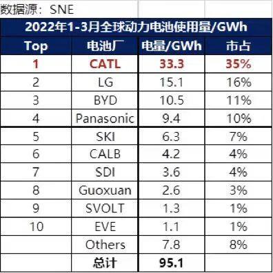 韓國(guó)市場(chǎng)研究機(jī)構(gòu)SNE Research的最新數(shù)據(jù)顯示,今年1-3月,寧德時(shí)代市占率為35%,排全球第一,LG新能源為16%,排第二,但大幅落后于寧德時(shí)代。2021年底,寧德時(shí)代和LG新能源的市占率分別為32.6%、20.3%。一升一降,二者差距進(jìn)一步拉大。