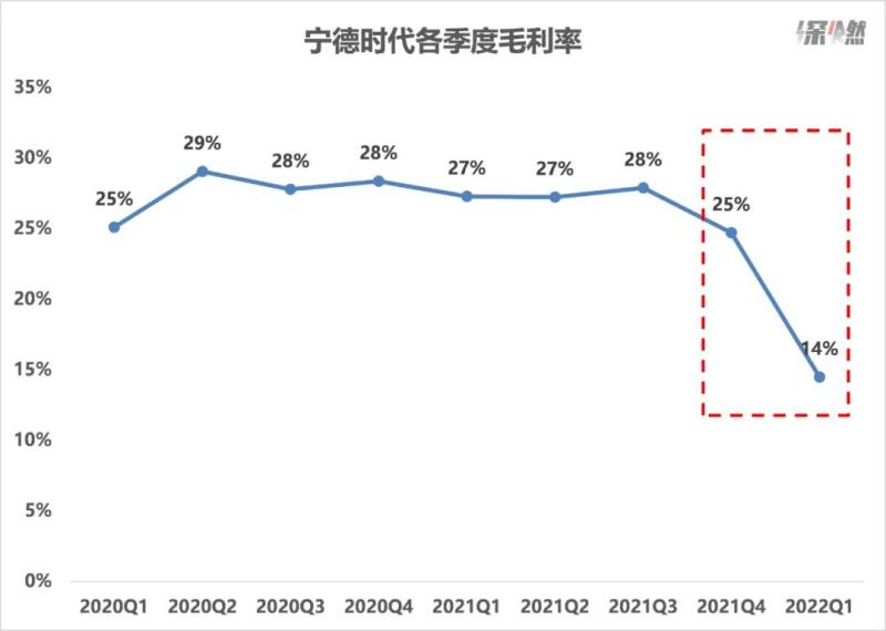 這也非常直觀地體現(xiàn)在了毛利率的變化中。在寧德時(shí)代的成本構(gòu)成中,直接材料的占比超過(guò) 75%。過(guò)去兩年來(lái),寧德時(shí)代每個(gè)季度的毛利率,都維持在25%以上,但是今年一季度,直接降到了14%。