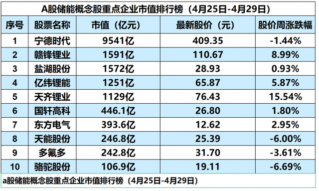 中國儲能網(wǎng)訊:受大盤情緒影響,本周(4月25日-4月29日)儲能概念板塊跌幅有所收窄,板塊整體下跌3.63%。這已是該板塊連續(xù)九周下跌。但本周《華夏時報》記者重點監(jiān)測的10家企業(yè)表現(xiàn)尚可,六家上漲,四家下跌。其中,天齊鋰業(yè)本周大漲15.54%,贛鋒鋰業(yè)上漲8.99%。