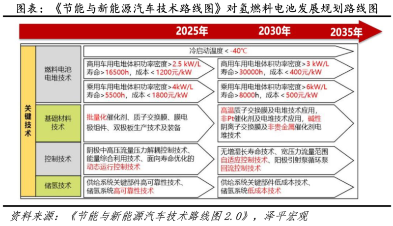 體積功率密度方面,根據(jù)《節(jié)能與新能源汽車技術(shù)線路圖2.0》,2025年商用、乘用氫燃料車電堆體積功率密度分別有望達(dá)2.5KW/L、4KW/L以上。