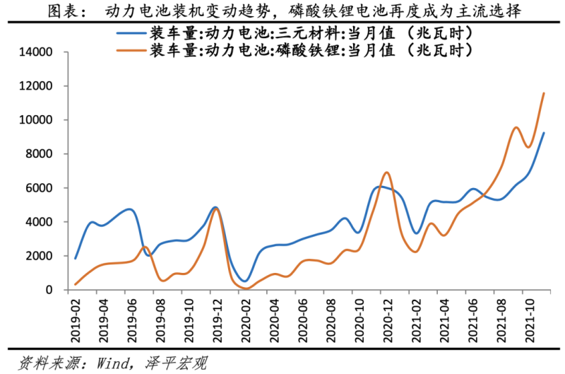 2021年以來,磷酸鐵鋰和三元電池產(chǎn)量格局再度出現(xiàn)逆轉(zhuǎn)。隨著政策補貼退坡,磷酸鐵鋰電池安全性和成本綜合優(yōu)勢再度凸顯。尤其是伴隨寧德時代CTP和比亞迪刀片電池等技術(shù)應(yīng)用,磷酸鐵鋰電池能量密度突破發(fā)展,未來或再度成為市場主流。2021年全年,磷酸鐵鋰電池裝車量累計79.8GWh,占動力電池總裝機量的51.7%,特斯拉、比亞迪、上汽、小鵬汽車等汽車廠商均大規(guī)模采用磷酸鐵鋰電池,預(yù)計磷酸鐵鋰電池占比到未來幾年將會提升到70%-80%以上。