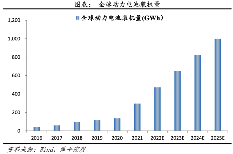 全球動力電池鋰電池2021年累計裝機量296.8GWh,同比增長102.3%。預(yù)計到2025年,全球汽車裝機規(guī)模約達(dá)1000GWh以上,僅中國汽車電池裝機量約達(dá)600GWh以上規(guī)模;到2030年,全球裝機規(guī)模或?qū)⑦_(dá)2000GWh以上,未來增量空間顯著。