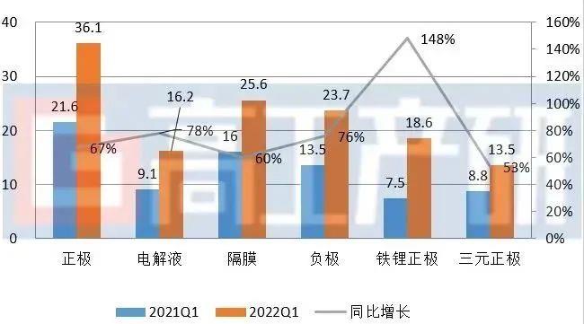 2、核心主材出貨量同比增長超50%,其中,正極材料市場鐵鋰占比超50%