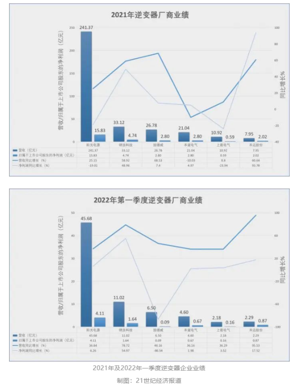 但在市場震蕩下,2021年逆變器板塊的成績單則反映出行業(yè)的盈利式微——盡管年內(nèi)產(chǎn)銷兩旺,但市場的激烈競爭令企業(yè)利潤受到壓縮,機構(gòu)資金回撤使得龍頭股的風(fēng)采不再。