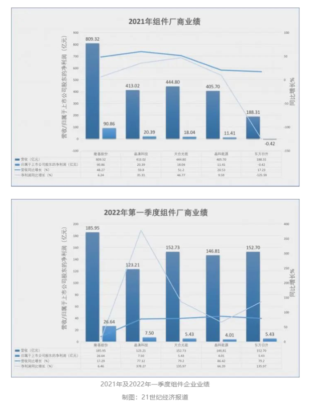 就出貨能力而言,2021年,國內(nèi)幾大組件廠商出貨量創(chuàng)下歷史新高,且向頭部集中。今年,組件的市場需求將進一步擴大,且業(yè)績反彈較為明顯。