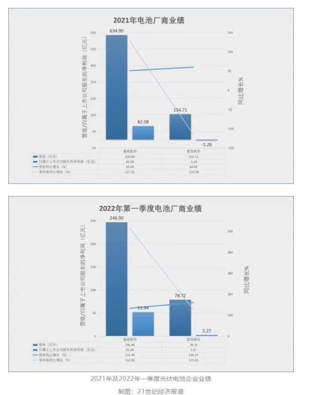 2021年,兩家主力光伏電池公司通威股份、愛旭股份電池業(yè)務(wù)分別實現(xiàn)營業(yè)收入超過240億元、153億元,在銷售量增長的推動下,銷售額雙雙提升。然而,兩家電池龍頭共同面臨的處境是,毛利率均出現(xiàn)嚴(yán)重下滑——通威股份電池業(yè)務(wù)毛利率為8.81%,較2020年減少5.73個百分點;愛旭股份電池業(yè)務(wù)毛利率為5.43%,較2020年減少9.07個百分點。