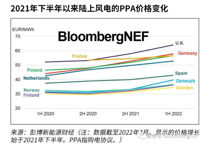 中國儲能網(wǎng)訊:歐洲各國無一例外地受到該地區(qū)能源危機的影響。2021年下半年至2022年上半年期間,所有市場的企業(yè)購電協(xié)議(PPA)價格均出現(xiàn)上漲。