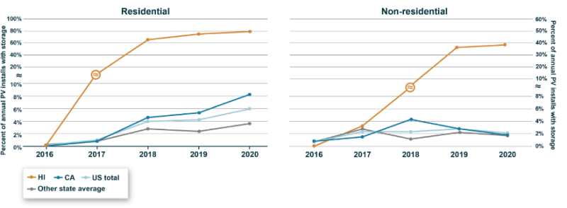 住宅太陽能發(fā)電設(shè)施配套部署儲能系統(tǒng)的比例一直在穩(wěn)步增長,但仍占市場的一小部分,占2020年安裝的美國住宅太陽能發(fā)電設(shè)施系統(tǒng)的6%(如圖11所示)。而在非住宅市場,2020年安裝的太陽能發(fā)電設(shè)施系統(tǒng)中只有2%配套部署儲能系統(tǒng),因為這些客戶更有可能獨立部署電池儲能系統(tǒng)。在住宅和非住宅市場中,夏威夷州因其凈計量改革而獨樹一幟,激勵更多的太陽能發(fā)電設(shè)施配套部署儲能系統(tǒng)。加利福尼亞州的住宅客戶可能會通過為防止森林火災(zāi)風(fēng)險而實施的斷電以及該州政府的激勵措施來增加電池儲能系統(tǒng)的部署。