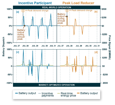太陽能+儲能項目的行為模型通常假設(shè)項目運營商優(yōu)化電池儲能系統(tǒng)使用以獲得批發(fā)市場收入。但在研究美國各地混合工廠的經(jīng)驗調(diào)度數(shù)據(jù)之后,發(fā)現(xiàn)只有少數(shù)在2020年運營的太陽能+儲能項目主要關(guān)注批發(fā)市場的價格信號。與其相反,特殊儲能激勵計劃(如SMART)的參與者關(guān)注激勵支付的時間(見圖a),負(fù)荷服務(wù)實體試圖減少其對容量和輸電需求費用的風(fēng)險(圖b),以及能源消費者優(yōu)先考慮彈性和公用事業(yè)賬單的最小化。這些替代商業(yè)模式可以為太陽能+儲能項目運營商帶來更高的收入,但不能從電網(wǎng)的角度優(yōu)化儲能調(diào)度,并且有時將會阻礙電網(wǎng)收益。