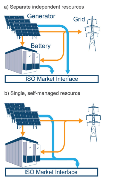 混合部署項目可以作為單一的、完全集成的資源或單獨但位于同一地點的資源與批發(fā)電力市場交互。作為一種綜合資源,混合項目運營商在開發(fā)市場投標(biāo)時必須預(yù)測風(fēng)力發(fā)電量或太陽能發(fā)電量,并管理其配套的電池儲能系統(tǒng)。作為單獨的資源進(jìn)行管理,批發(fā)市場運營商將實施方法來管理電池儲能系統(tǒng)的調(diào)度和風(fēng)力發(fā)或太陽能發(fā)電的可變性,同時考慮任何耦合約束。