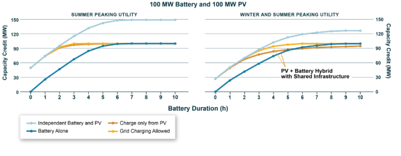 圖8.不同持續(xù)時間的電池儲能系統(tǒng)、太陽能發(fā)電設(shè)施和混合部署項目之間的容量信用比較