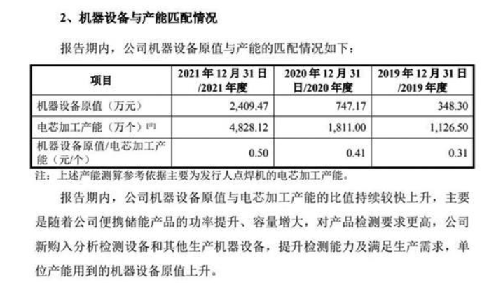 公司的說法是,“報告期內,公司機器設備原值與電芯加工產能的比值持續(xù)較快上升,主要是隨著公司便攜儲能產品的功率提升、容量增大,對產品檢測要求更高,公司新購入分析檢測設備和其他生產機器設備,提升檢測能力及滿足生產需求,單位產能用到的機器設備原值上升。”