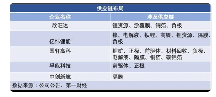 欣旺達(dá)通過2019控股海西粵閃達(dá)和金藏膜、2021投資建設(shè)甕安縣“礦化一體”新能源材料循環(huán)產(chǎn)業(yè)項(xiàng)目、2022年浙江鋰威產(chǎn)業(yè)園(二期)基膜涂覆項(xiàng)目實(shí)現(xiàn)主廠房封頂布,分別布局局鋰電池材料包括鋰資源、涂覆膜、銅箔以及負(fù)極。