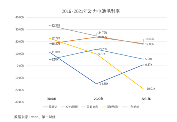 通聯(lián)數(shù)據(jù)datayes!顯示,受“蔚小理”青睞的欣旺達(dá)2019-2021年動(dòng)力電池收入為8.49億、4.28億、29.33億元,僅占公司總營(yíng)收的3.36%、1.44%、7.85%,毛利率分別為11.31%、-14.85%、-0.87%。同期公司手機(jī)數(shù)碼類產(chǎn)品的毛利率分別為17.06%、18.24%、18.39%,可見動(dòng)力電池業(yè)務(wù)仍在“拖后腿”。