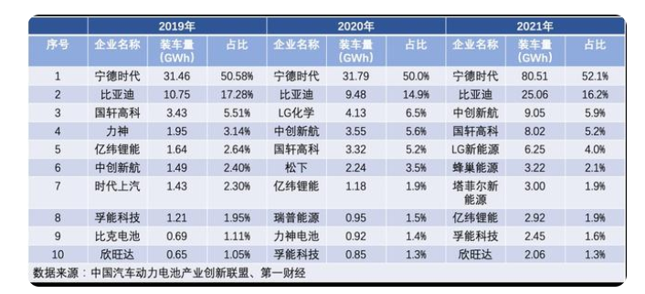 其中,國(guó)軒高科從2019的第三名略降至2021年第四名;億緯鋰能排名連續(xù)三年下滑,2019-2020年分別為第五、第七、第八(并列第七)位;孚能科技市場(chǎng)份額則從2019年的1.95%降為2021年的1.69%;欣旺達(dá)2020年沒有擠入前十,但2021年的裝車量占比較2019年提升了0.25個(gè)百分點(diǎn);中創(chuàng)新航則穩(wěn)步發(fā)展,市場(chǎng)份額實(shí)現(xiàn)三連升,到2021年一躍成為全國(guó)裝機(jī)量第三名。