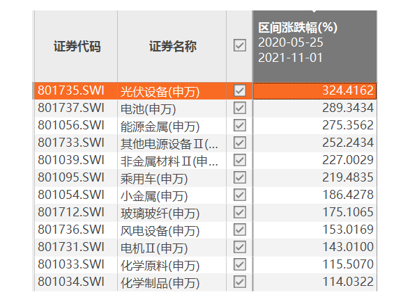 上圖是在大盤技術性回調前,申萬一級行業(yè)板塊從2020年年中至2021年年底的區(qū)間行情,可見,電力設備獨占鰲頭,以186%的漲幅領跑;而根據(jù)申萬二級行業(yè)中,光伏設備板塊的表現(xiàn)更是“皇冠上的明珠”,以320%左右的漲幅跑贏了近兩年的大熱門板塊鋰電池。