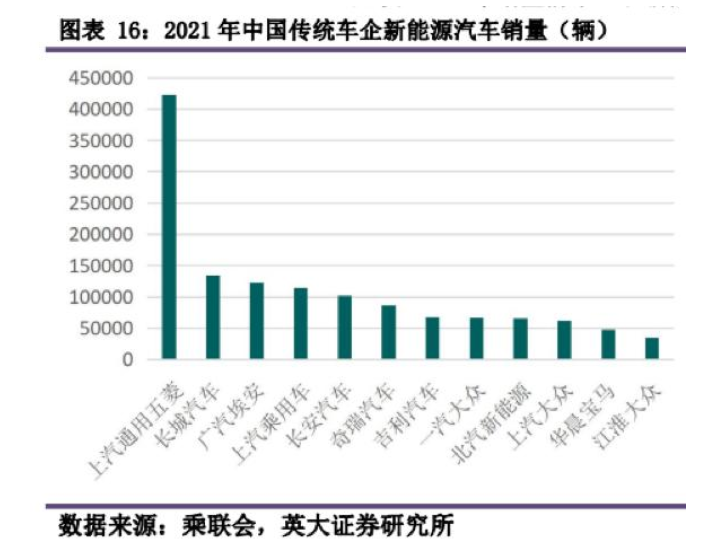 據(jù)英大證券研究所數(shù)據(jù)顯示,2021年銷量前十五名新能源車企中,傳統(tǒng)車企占據(jù)十個席位,比重已越來越大。