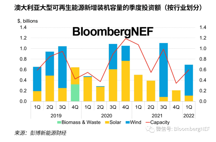 彭博新能源財經(jīng)估計,2022年第一季度,澳大利亞大型可再生能源新增裝機容量獲得投資6.94億美元(9.5億澳元)——繼2021年第四季度微弱增長后,該季度環(huán)比增幅達到233%,且在2021年第一季度基礎(chǔ)上同比增長38%。據(jù)估計,屋頂光伏等小型分布式裝機容量獲得投資8.05億美元。