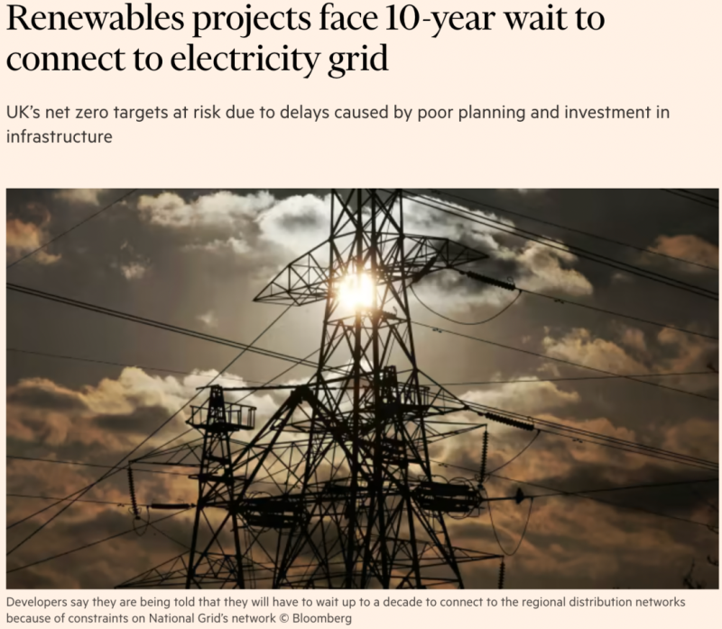中國儲能網(wǎng)訊:英國《金融時報》報道,英國可再生能源開發(fā)商在將新產(chǎn)能接入電網(wǎng)方面面臨長達十年的延遲,威脅到英國放棄化石燃料、實現(xiàn)凈零目標的承諾。