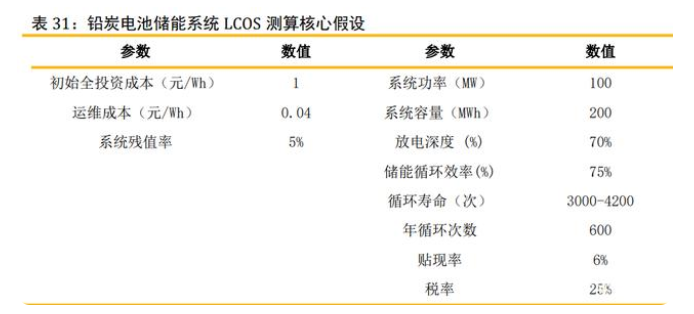鉛炭電池儲(chǔ)能全壽命儲(chǔ)能度電成本(LCOS)測(cè)算核心假設(shè): 1)初始投資成本:鉛炭電池儲(chǔ)能系統(tǒng)中電芯成本較低,假設(shè)初始全投資成本為 1 元 /Wh。 2)年度運(yùn)維成本假設(shè):每年需要4%左右,為0.04元/W。 3)放電深度:鉛炭電池放電深度較低,為60-70%。 4)壽命:可循環(huán)2000次以上,多家企業(yè)表示,其鉛炭電池可在70%放電深度條件下 達(dá)到4200次的循環(huán)壽命。 4)循環(huán)效率:綜合多種文獻(xiàn),鉛炭電池循環(huán)次數(shù)可以達(dá)到70-85%,這里暫定75%, 部分可達(dá)80%以上。 5)貼現(xiàn)率:考慮到當(dāng)前央企能源企業(yè)的融資成本在4-5%,我們選取6%作為折現(xiàn)率。