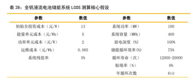 全釩液流電池儲(chǔ)能全壽命儲(chǔ)能度電成本(LCOS)測(cè)算核心假設(shè):