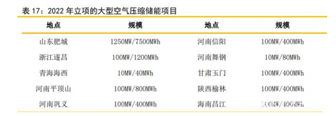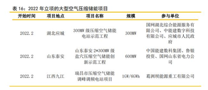 2022年以來(lái)大功率項(xiàng)目開始快速上馬。2022年2月,湖北應(yīng)城300MW(兆瓦)級(jí)壓縮 空氣儲(chǔ)能電站示范項(xiàng)目簽約活動(dòng);山東省泰安市推進(jìn)開發(fā)600MW(20MW)級(jí)鹽穴壓縮空氣 儲(chǔ)能電站;葛洲壩能源重工有限公司擬位于瑞昌市投資約80億元,建設(shè)規(guī)模為 1000MW/6000MWh的壓縮空氣項(xiàng)目。