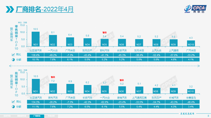 從狹義乘用車零售銷量排名前十的企業(yè)來看,表現(xiàn)分化,但多數(shù)企業(yè)銷量出現(xiàn)腰斬。