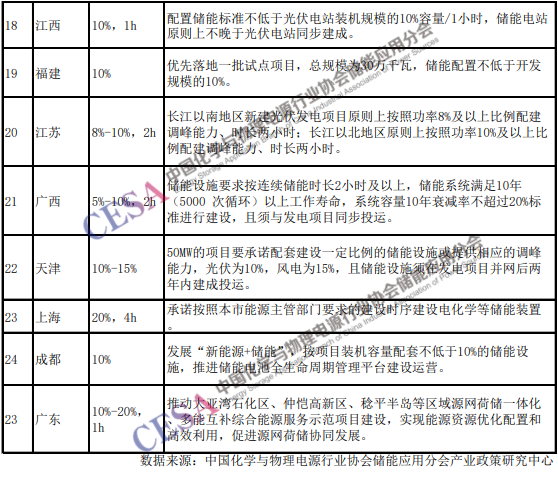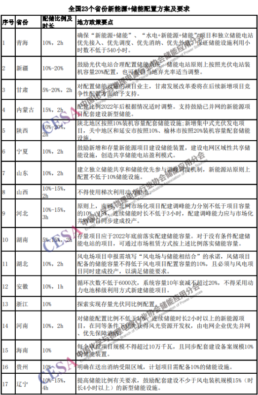 據(jù)中國化學與物理電源行業(yè)協(xié)會儲能應用分會產(chǎn)業(yè)政策研究中心統(tǒng)計,目前,國內(nèi)已有25個省市自治區(qū)出臺了新能源項目配建儲能設施的相關政策,政策要求新能源配置儲能比例基本量化在10%左右、時長不低于1-2小時。