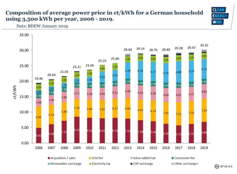 中國儲能網(wǎng)訊:根據(jù)德國能源和水業(yè)協(xié)會(BDEW)的數(shù)據(jù),2019年德國三人的普通家庭平均每年耗電3,500千瓦時(shí),每月電費(fèi)為88.1歐元(約合人民幣690元)。這個(gè)電費(fèi)的 名義價(jià)格比1998年高出約77%,但如果按通貨膨脹調(diào)整則增幅為33%。德國家庭電費(fèi)增長的最主要原因是可再生能源附加費(fèi)的引入。