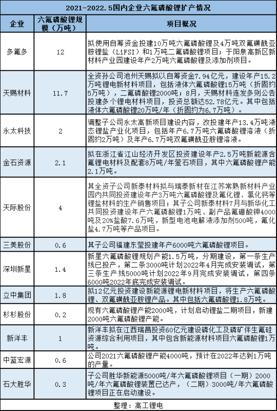 高工鋰電統(tǒng)計梳理顯示,2021年以來,包括多氟多、天賜材料、永太科技、金石資源、天際股份、三美股份、杉杉股份、石大勝華等多家企業(yè)紛紛加碼六氟磷酸鋰產能。規(guī)劃新增產能達37.7萬噸。
