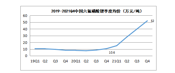 對于市場供需的錯判以及主要原材料碳酸鋰、VC溶劑價格的飆升,導致2020年Q4以來六氟磷酸鋰的“大牛市”。六氟磷酸鋰價格從2020Q4的10.6萬元/的噸上升至2021Q4的52萬元/噸。