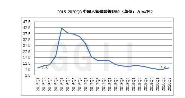 然而不及預期的是,新能源汽車補貼的滑坡,動力電池價格向下,疊加六氟磷酸鋰新增產能的集中釋放,市場供過于求致使六氟磷酸鋰價格一路暴跌,至2020年Q3下探至7.5萬元/噸。