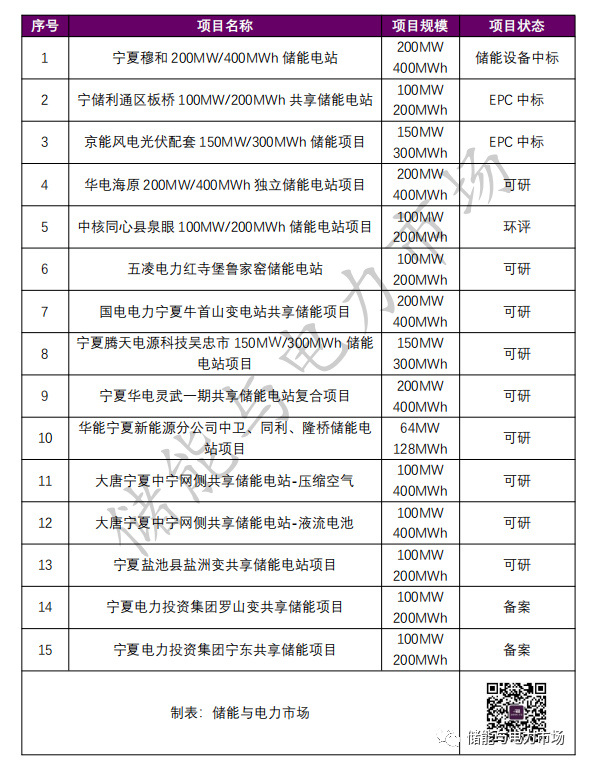 部分寧夏儲(chǔ)能項(xiàng)目進(jìn)展情況