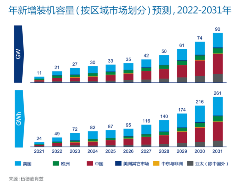 隨著電池組成本繼續(xù)下降、可再生能源滲透率的提高,以及對儲能等靈活性資源的需求增加,預(yù)計未來十年,全球儲能市場的累計新增裝機容量將擴大近九倍,實現(xiàn)460GW/1,292GWh。