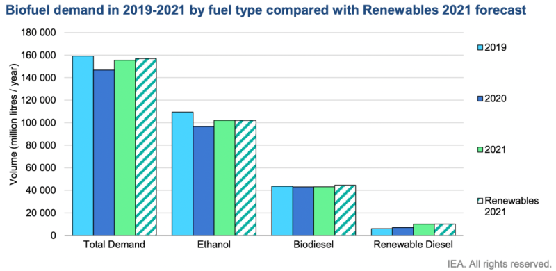 2021年,生物燃料從疫情大流行的低點(diǎn)恢復(fù)到1550多億升,接近2019年的水平。預(yù)計(jì)2022年增長5%,2023年增長3%。