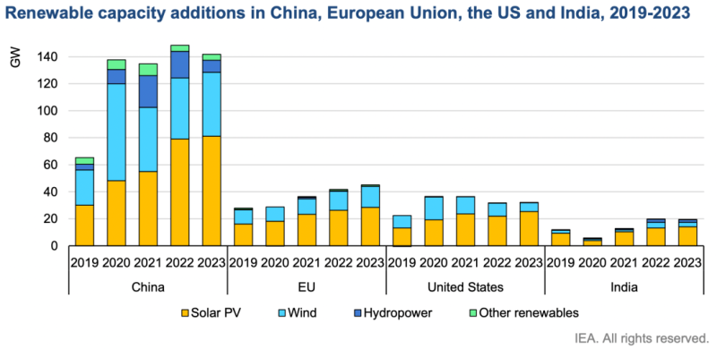 根據(jù)目前政策走向,可再生能源的全球增長2023年將失速,因?yàn)樘柲馨l(fā)電的持續(xù)增長被水電下降40%和風(fēng)力發(fā)電增加量幾乎沒有變化所抵消。